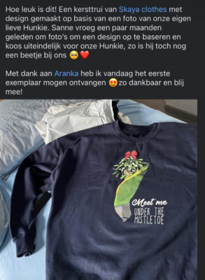 Hoi! Ik ben Sanne – creatieve dierenliefhebber en moeder – en achter elk ontwerp in deze webshop zit een verhaal. Bij Skaya combineer ik mijn liefde voor papegaaien met handgemaakte illustraties vol kleur, humor en karakter. Alles wordt met zorg ontworpen, gedrukt en ingepakt, gewoon door mijzelf.