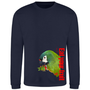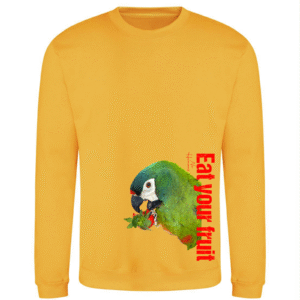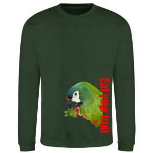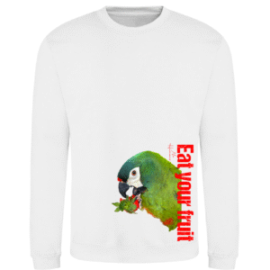 “Maak een statement met deze hilarische sweater met de tekst ‘Eat Your Fruit, No Humans’ en een speelse afbeelding van een ara maracana (Illiger’s macaw). De afbeelding is creatief aan de zijkant van de trui geplaatst, waardoor het een unieke en opvallende look krijgt. De print komt het beste tot zijn recht op een zandkleurige sweater (zoals op het voorbeeld). Perfect voor vogelliefhebbers die van humor en stijl houden!”