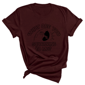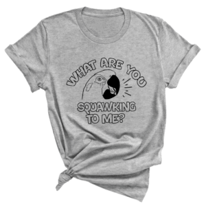 “Breng humor en stijl samen met onze collectie unieke t-shirts featuring grappige vogelontwerpen en de tekst ‘What Are You Squawking To Me?’. Perfect voor vogelliefhebbers die graag een speelse boodschap overbrengen.”