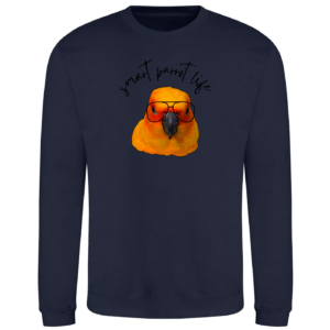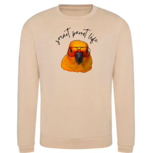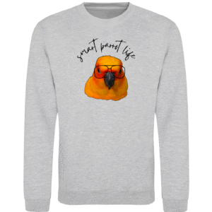 “Met deze geweldige sweater met print van een zonparkiet met een bril, maak je een slimme statement. Een leuke vooraanzicht foto print van een slimme vogel.”
