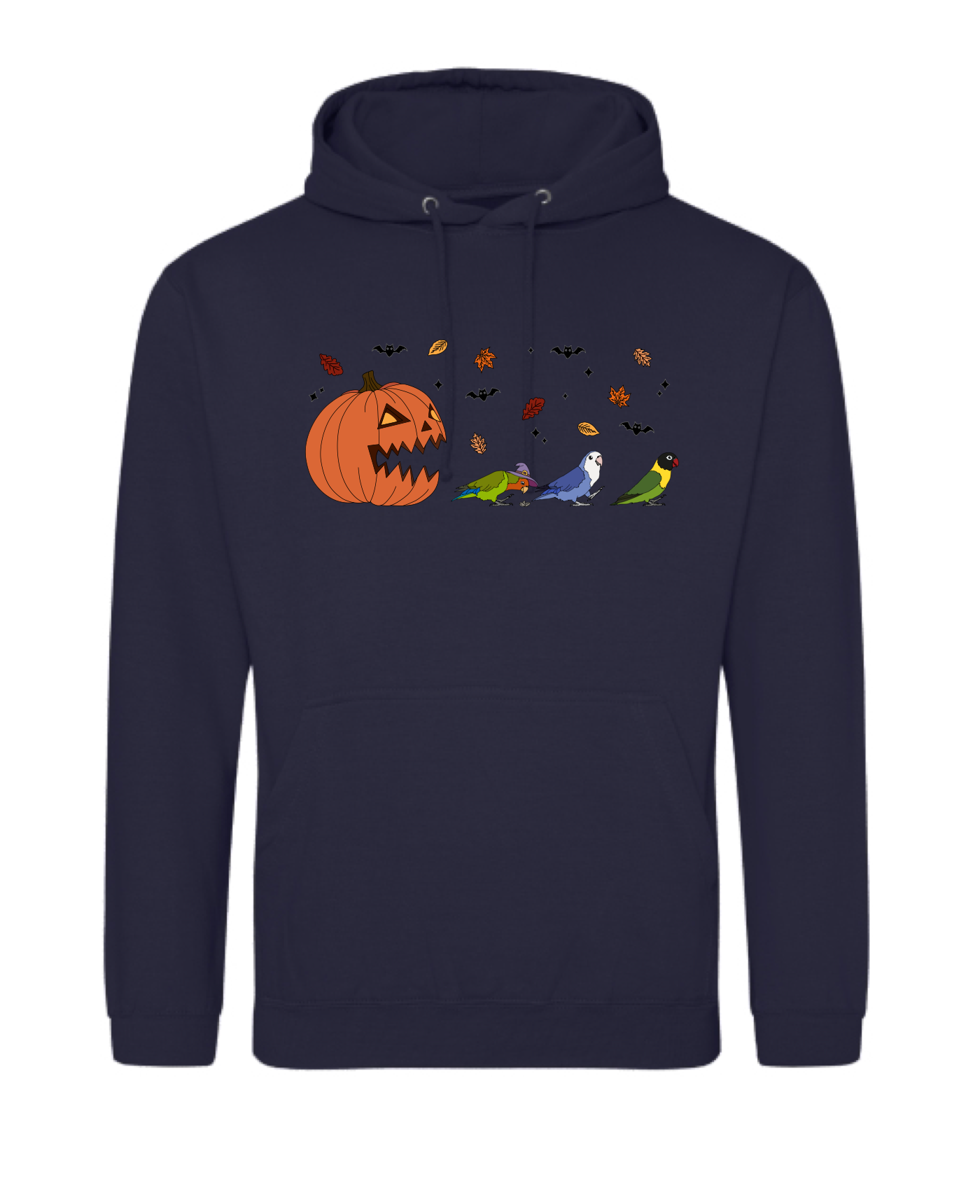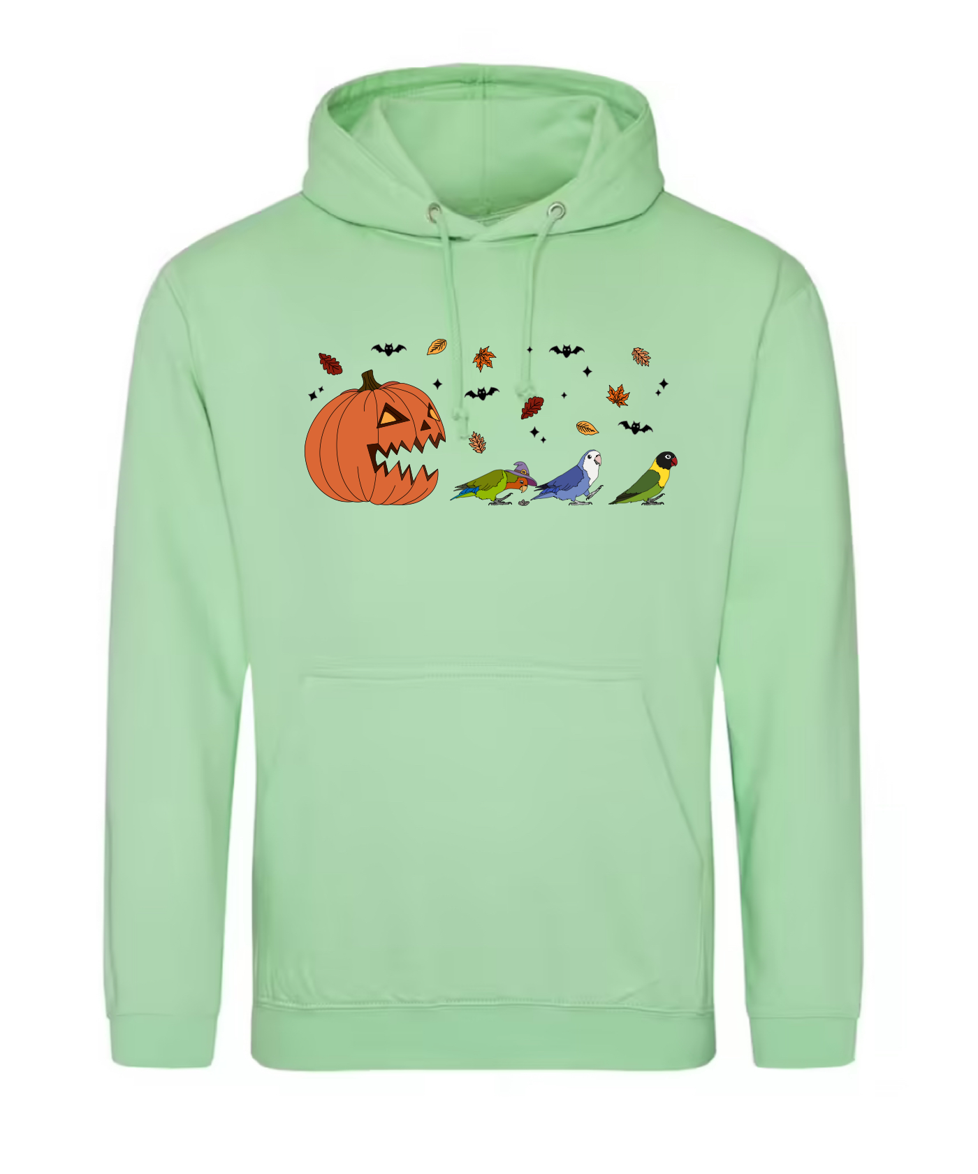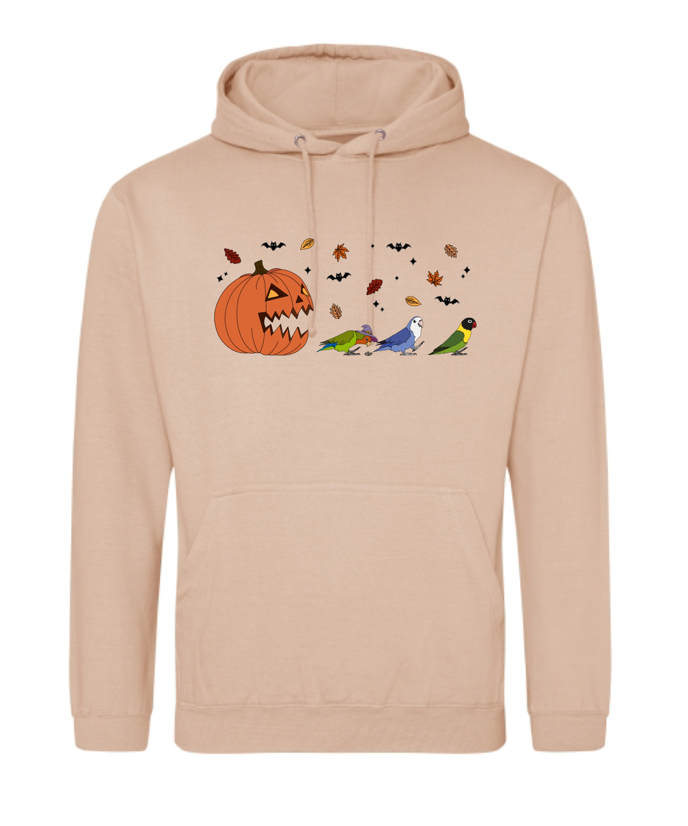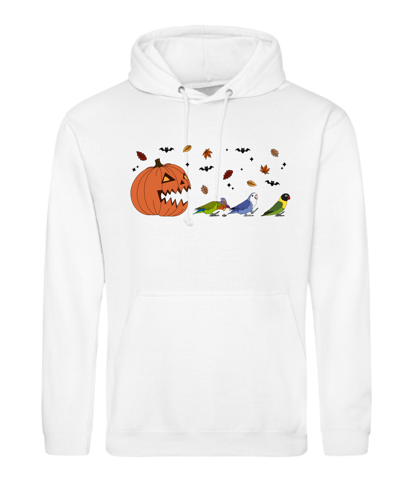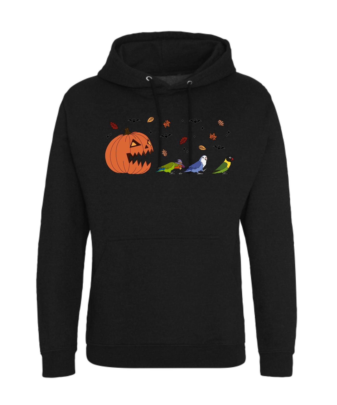 “Drie spooky agapornissen. In een blaadjes storm, die snel weg rennen voor de grote pompoen. Klaar voor Halloween en herfst. Een leuke hoodie voor die wat natte herfst dagen “